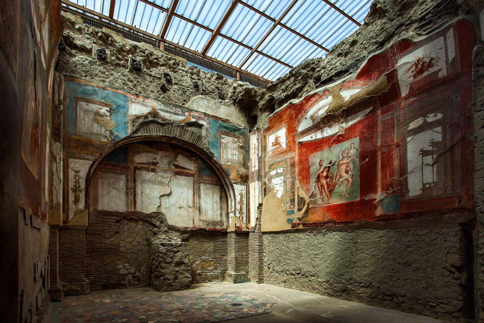 One not-to-miss spot in Herculaneum is Sede degli Augustali, which is a square structure used as the seat to the College of the Augustales. Well preserved, the building features two amazing frescos, one depicting Hercules entering Mount Olympus and the other of Hercules fighting Achelous. Next is the House of Neptune and Amphitrite. Inside this house are two gorgeously vibrant glass mosaics as well as marble masks hanging from above one of them. There is also the Villa of the Papyri, which was considered to be one of the most luxurious villas in all of an already luxurious Herculaneum. Nestled upon the ancient coastline of what is now the Gulf of Naples, it is said to be once owned by Julius Caesar’s father-in-law. The front of the villa stretches 250 meters across and was home to over 1,700 papyrus scrolls which were carbonized as a result of the eruption. These scrolls were later figured out to have contained several valuable Greek philosophical texts.